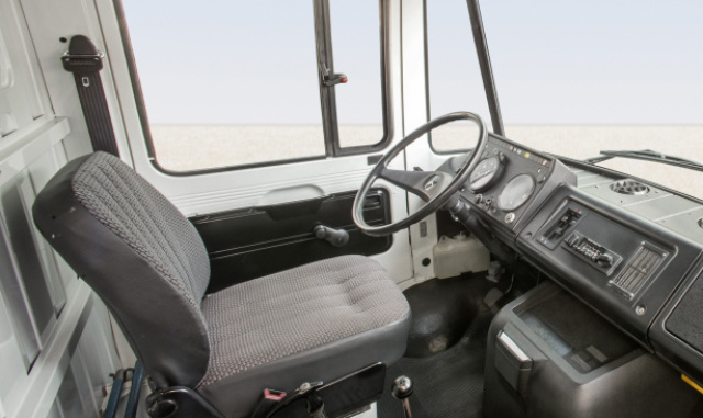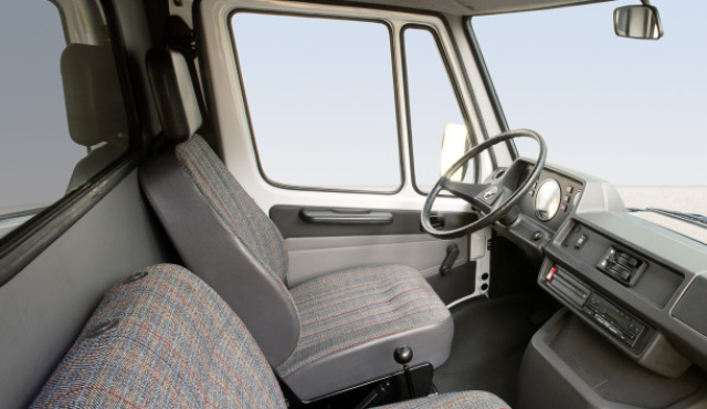Einen bislang unbekannten Komfort im Segment der leichten Nutzfahrzeuge bot auch der Fahrerarbeitsplatz. Serienmäßig stattete Mercedes-Benz die neuen Transporter mit einem längs und in der Höhe verstellbaren Fahrersitz aus. Hinter dem dick umschäumten Zweispeichen-Lenkrad lieferte die gut einsehbare und übersichtlich gegliederte Armaturentafel alle nötigen Informationen auf einen Blick. Für beste Sicht nach vorn sorgte die große Frontscheibe. Heizung und Lüftung verfügten über ein zweistufiges Gebläse.