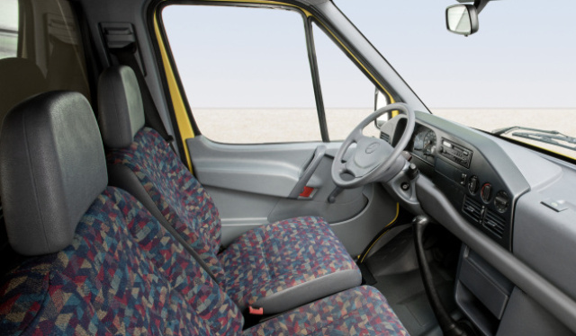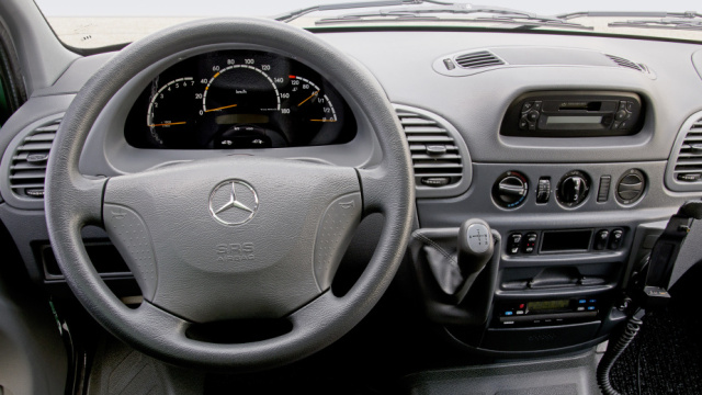 Zahlreiche Ablagen, darunter ein großzügig dimensioniertes, abschließbares Handschuhfach, erleichterten den Arbeitsalltag im Sprinter. Der Fahrersitz war zweimal in der Höhe verstellbar, damals im Transportersegment eine Sensation. Ein Novum waren ebenfalls die Drehregler für Heizung und Lüftung im Pkw-Stil inklusive eines kräftigen vierstufigen Gebläses und Umluftschaltung. Wohnliche Atmosphäre schufen auch die nahezu rundum verkleideten Wände und Türen. Der optionale Fahrer-Airbag, höhenverstellbare Dreipunkt-Sicherheitsgurte und Gurtschlösser am Sitz zeugten darüber hinaus von der Vorreiterrolle, die der Mercedes-Benz Sprinter in puncto Sicherheit einnahm.