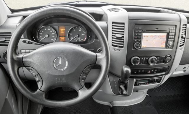 Das Interieur glänzte darüber hinaus mit einer Vielzahl von durchdachten Ablagen, wie zum Beispiel eine Dachgalerie über der Windschutzscheibe. Außenspiegel mit zusätzlichen Weitwinkelgläsern vermittelten einen guten Blick auf den rückwärtigen Verkehr – der so genannte tote Winkel wurde auf ein Minimum reduziert. Charakteristisch für das neue Sprinter Cockpit war die herausgehobene Mittelkonsole mit dem Joystick-Schalthebel. Als wertvolle Arbeitshilfe bot Mercedes-Benz für den Sprinter erstmals das Infotainmentsystem COMAND APS mit integriertem Navigationssystem an. Ebenfalls neu war das Multifunktionslenkrad.