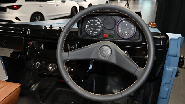 Der 240 GD Wolf wird angetrieben durch einen 2.4 Liter-Motor mit der Kennung OM 616. Der Diesel-Reihenvierzylinder leistet knackige 72 PS. Damit musste der Wolf, der seine Verwendung in zahlreichen Militärs auf dieser Welt fand, über Stock und Stein krabbeln. Zumeist sehr erfolgreich! Die "enorme" Kraft dieser 72 Pferdestärken wird mittels 4-Gang-Getriebe wahlweise an alle vier Räder übertragen. In dem singapurischen Ex-Veteran können sechs Personen mitfahren. Neben Fahrer und Beifahrer nehmen die anderen vier Mitfahrer auf den hinteren Bänken Platz. Dürfte der Wolf in Singapur noch in Tarnfarben unterwegs gewesen sein, wurde er von Lorinser Classic neu-lackiert. Die Wahl fiel auf Chinablau in Kombination mit dattelfarbenem Leder. So wird aus einem spartanischen Wolf ein ziemlich cooler Beachcruiser.