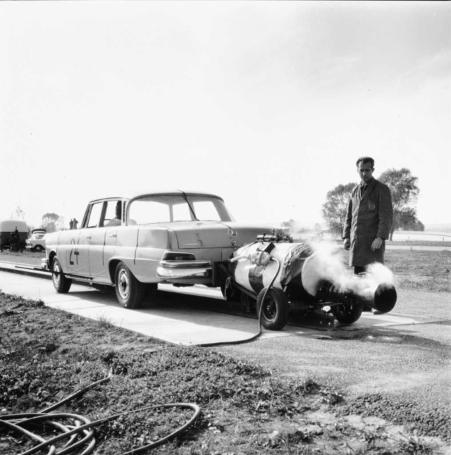 Früher und konsequenter als viele andere Automobilbauer widmet sich Mercedes-Benz dem Thema Sicherheit. Fahr- und Crashtest gehören bereits seit 1959 zum Entwicklungsprogramm der Stuttgarter. Dabei schrecken die Ingenieure auch vor vermeintlich exotischen Versuchsaufbauten zurück. Wie wäre sonst eine Heißwasserrakete am Heck einer zeitgenössischen Heckflosse zu erklären? Was abenteuerlich klingt, sorgt bei den Crashtests tatsächlich für mehr Praxisnähe. So hat die Rakete die Aufgabe, den Testwagen auf seine letzte Fahrt zu schicken. Die verläuft auf Schienen schnurstracks in Richtung eines Hindernisses, die Rakete sorgt dabei für die Beschleunigung auf die gewünschte Endgeschwindigkeit und schaltet sich anschließend ab. 1962 ist das Premierenjahr dieser Crashvariante. Vorher wurde der Wagen weniger praxisgerecht mit einer Seilwinde Richtung Hindernis gezogen.