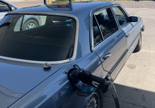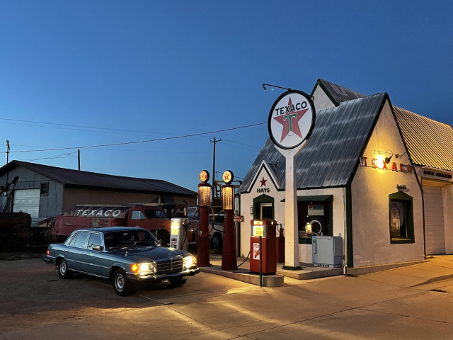 Die Flächenstaaten der USA haben eben ihren ganz eigenen Charakter. Links und rechts der Straße gibt es nicht viel mehr zu sehen als endlose Weizen- und Maisfelder – selten durchbrochen von Baumgruppen, kleinen Ortschaften und zahllosen Großsilos, die von Mähmaschinen und Großtraktoren versorgt werden. Für bunte Abwechslung sorgen nicht nur die grünen oder roten Trecker, sondern die endlos langen Zugwürmer, die über die welligen Landschaften gefühlte hunderte von Waggons hinter sicher herschleppen. Die Orte selbst sind klein; auch wenn die Ortsschilder nicht immer die Einwohnerzahlen verraten. In Wyoming kann man die Zügel des 450ers lockerlassen, denn der Verkehr ist dünn, die kleinen Straßen gut aufgebaut und die Tempolimits für US-Verhältnisse mit 75 oder gar 80 mph entspannt. Nach ein paar Tagen hinter dem Steuer und mit mehr als 2.000 gefahrenen Meilen bekommen die Ledersitze ein dickes Lob – die 43 Jahre merkt man dem W116er – auch dank Aufpolsterung und neuen Tierhäuten nicht an. Zum Meilenfressen ist er als historisches Fahrzeug perfekt.