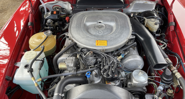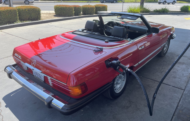 Die Tour beginnt morgens rund eine Stunde südlich von Los Angeles und so kann der rote Mercedes 380 SL auf den Highways 5, 10 und 405 im dichten Stadtverkehrs des Großraums Los Angeles erst einmal zeigen, was er im Alltagsbetrieb kann. Dach manuell runtergeklappt, Scheiben elektrisch heruntergefahren und im Becker Radio rasselt KIIS FM mit den aktuellen Hits nachdem sich die elektrische Hirschmann-Antenne in den sonnigen Himmel gereckt hat. Bereits auf den ersten Meilen fällt auf, dass der Motor nicht den Dampf hat, den man von dem bekannten Achtzylinder erwartet hätte. Der Grund liegt in der seinerzeit ungewöhnlich strengen Abgasgesetzgebung der USA, denn statt der üblichen 150 kW / 204 PS leistet das 3,8 Liter große Triebwerk gerade einmal schmale 114 kW / 155 PS und auch die 267 Nm sind deutlich weniger, als es die Kunden in Europa genießen können. Der 380er löste bis 1985 den 450 SL ab.