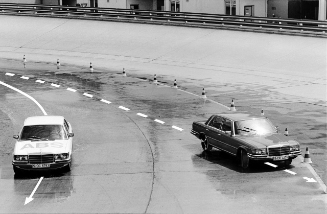 Die Premiere des Anti-Blockier-Systems vor 40 Jahren ist die frühe Sternstunde in der einzigartigen Innovationsgeschichte digitaler Assistenzsysteme von Mercedes-Benz. Die Vorgeschichte von ABS reicht bei Mercedes-Benz jedoch zurück bis in die 1950er-Jahre. 1953 meldet Hans Scherenberg, damals Konstruktionschef von Mercedes-Benz, ein Patent zum Verhindern des Blockierens von Fahrzeugrädern beim Bremsen an. Ähnliche Lösungen gibt es zwar schon in der Luftfahrt (Anti-Skid) und bei der Eisenbahn (Knorr-Gleitschutz). Doch das Automobil ist ein sehr komplexes System, das besonders hohe Herausforderungen an die Sensorik, Signalverarbeitung und Steuerung stellt. Beispielsweise müssen die Komponenten die Drehverzögerungen und die Beschleunigung der Räder auch bei Kurvenfahrt, Bodenunebenheiten und starker Verschmutzung fehlerfrei registrieren.