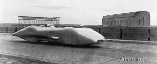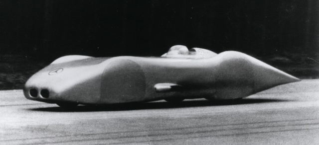Basierend auf dem Silberpfeil W125 erhielt der Rekordwagen neben dem weiterentwickelten V12-Motor auch eine flache, voll-verkleidete Karosse mit keilförmigem, auslaufendem Heck. Eine Windkanalmessung ergab einen cW-Wert von 0,157. Die Empfehlungen für die Aerodynamik kommt aus der Flugzeugindustrie. Ernst Heinkel und Willy Messerschmitt bringen ihre Erfahrungen und Ideen aus dem Flugzeugbau mit ein und sorgen für ein „Masterpiece“ der Stromlinien.