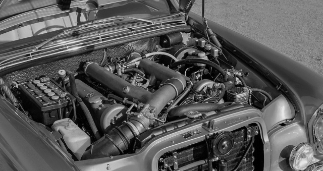 Mit dem Mercedes 600 teilt sich das ebenfalls elitäre Topmodell des Mercedes 300 SEL 6.3 den überaus potenten Antrieb. Der 6,3 Liter große Achtzylinder der Bauart M100 leistet 184 kW / 250 PS und gigantische 500 Nm maximales Drehmoment bei 2.800 U/min. Der Achtzylinder bietet unter anderem eine Achtstempel-Einspritzpumpe mit Start- und Warmlaufautomatik, die Gaspedalstellung, Motordrehzahl, Luftdruck und Kühlwassertemperatur berücksichtigt. Der Kraftstoff wird über acht Düsen mit maximalem Druck in die Saugrohre gespritzt – das bringt die damals opulente Leistung an die Hinterachse. Um den Motor in der Baureihe W 109 unterzubringen, wurden eigens Rahmenvorbau, Getriebetunnel und Wagenboden geändert. Die Topversion des 6.3 geht dabei zurück auf eine Idee des Versuchsingenieurs Erich Waxenberger. Er erkennt das Potenzial des V8-Motors aus dem Typ 600 auch für die Baureihe W 109. Zunächst ohne Wissen des Entwicklungschefs Rudolf Uhlenhaut baut er ein Erprobungsfahrzeug auf. Doch dem bleibt das Tun nicht lange verborgen: Er hört den an seinem Büro mit dezentem Motorgrollen vorbeifahrenden Prototypen, beordert Waxenberger umgehend zum Rapport – und lässt diesen für die Weiterentwicklung gewähren.