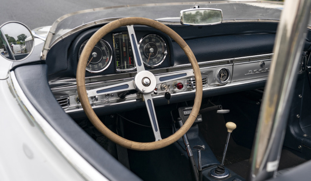 Als ob der Mercedes 300 SL als Flügeltürer oder Roadster nicht schon grandios genug wäre – es geht eben noch eine ganze Ecke schärfer. Für den donnernden Nachtausflug auf den Rennkurs von Le Mans soll es ein echter Rennwagen sein. Der Mercedes 300 SLS O’Shea ist eine wahre Rarität, von der allein zwei Modelle gab. Die offene Rennversion des 300ers, benannt nach Rennfahrer Paul O’Shea, basiert auf dem coolen 300er Roadster, wurde für den erfolgreichen Einsatz auf der Rundstrecke jedoch überaus umfangreich modifiziert. So fehlt ihm nicht nur das Dach, sondern auch die Windschutzscheibe. Eine kurze Windlippe soll den Fahrer ebenso vor den schlimmsten Umwelteinflüssen bewahren wie der Einbügel hinter dem wohl konturierten Sportsitz. Dazu fehlen Stoßstangen und verschiedene Komfortdetails der rollende Sternenlegende. Statt der üblichen 1,3 Tonnen bringt der Mercedes 300 SLS O‘Shea so gerade einmal noch 970 Kilogramm auf die Waage – zusammen mit dem Leistungsnachschlag auf 173 kW / 235 PS statt der üblichen 158 kW / 215 PS perfekte Dreingaben für eine unvergleichliche französische Nacht.