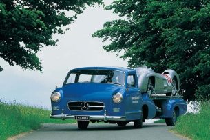 Nicht nur die legendären Silberpfeile machen in den frühen 1950er-Jahren von sich reden. Mit dem „schnellsten Renntransporter der Welt“ sorgt Mercedes-Benz auch neben der Rennpiste für Aufsehen. Rennleiter Alfred Neubauer wird zu dem Sonderfahrzeug von dem 1924 gebauten Rennwagen-Transporter auf Basis eines großen Mercedes-Tourenwagen inspiriert. Schnell soll der Renntransporter sein, sehr schnell – und das samt Ladung, sprich einem Grand-Prix-Boliden oder SLR-Rennsportwagen. Vom Typ 300 S stammt der X-Rohrrahmen als Basis, der leistungs­fähige Motor kommt aus dem 300 SL, weiterhin nehmen die Väter des Renntransporters Teile des Typs 180. So entsteht ein optisch und technisch einmaliges Fahrzeug mit 3050 Millimeter Radstand, das je nach Zuladung 160 bis 170 km/h schnell ist. 1955 ist der Schnelltransporter einsatzbereit. Die Rennabteilung setzt ihn vor allem für Sonderaufgaben ein, wenn ein Wagen nach letzten Abstimmungen oder Änderungen schnell zur Strecke gebracht werden muss oder nach dem Rennen schneller zurück ins Werk soll, um mehr Zeit für Reparaturen zu haben. Der Renntransporter wird zum Sympathieträger jenseits der Rennstrecke zur Sensation auf den Straßen Europas. 1993 fällt die Entscheidung, den im Original nicht erhaltenen Solitär wieder aufzubauen. Sieben Jahre tüfteln die Experten, 2001 steht der Renntransporter dann wieder in ganzer Pracht auf seinen Rädern. Im neuen Mercedes-Benz Museum ist er mit einem 300 SLR (W 196 S) auf der Ladefläche zu sehen.
