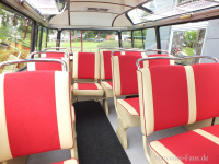 Im Innenraum ging es übersichtlich zu: Das Cockpit bestand aus einem Tacho mit integrierter Uhr, einem Kühlwasserthermometer und ein paar Knöpfen - Ende. Eine Benzinuhr, die den aktuellen Füllstand des 60-Liter-Tanks anzeigt, war serienmäßig nicht an Bord. So dürftig das Armaturenbrett war, so spartanisch mutet auch der Rest an, doch die zehn Sitzplätze scheinen nur unbequem. Manfred hat alle Sitze komplett neu aufgearbeitet, die Gestelle lackiert und Bügel verchromt, dazu hab es natürlich neue Bezüge und Polster.