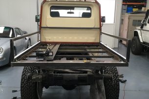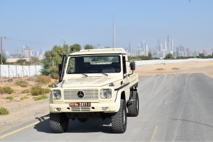 "Der Koffer Aufbau wurde abgenommen und wir fertigten eine Pick-up Pritsche nach meinen Vorstellungen an. Als Bereifung wählten wir einen 315/75/16 auf Hutchinson Felge. Farbton ist RAL 1015 Hell Elfenbein wie ab Werk. Das Verteiler Getriebe hat einen zuschaltbaren Nebenantrieb, der in Zukunft einen Kompressor antreiben soll. Wir fahren den Wagen nun seit einem halben Jahr mit Dubai Classic Nummernschild absolut störungsfrei, der Verbrauch liegt bei circa 17-19 Litern Super und die Fahrleistungen sind mehr als ausreichend. Aufgrund der super kurzen Achs-Übersetzung liegt die Höchstgeschwindigkeit bei Ohren betäubenden 140Km/h.“