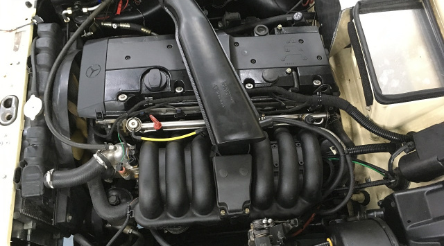 "2 Jahre später traf ich diesen, der mittlerweile Geldnöte hatte, wieder. Schon war der Wagen meiner! Der Wagen war ein Schalter mit einem 2.8 Liter M110 Motor. Dieser musste einem M104 mit Automatikgetriebe weichen. Der neue Motor hat 3.2 Liter Hubraum und stammt aus einer W140 S-Klasse. Im Innenraum blieb bis auf die Sitze vom W463 und dem Lenkrad alles original. Der Motor bekam eine neue, selbst programmierte Motor Elektronik von ECU Master."