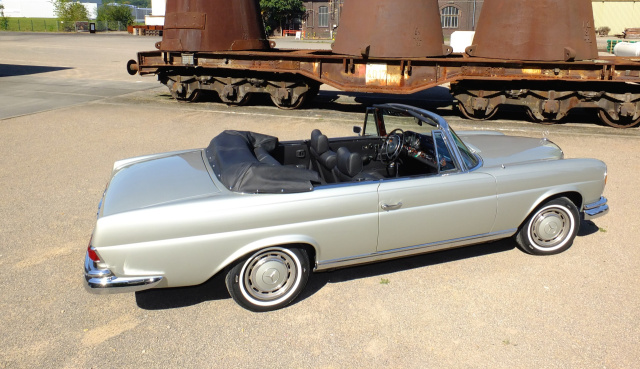 Dieses Mercedes-Benz 280 SE Cabrio gehört zu den letzten Hochkühler-Modellen des 69er Baujahres. Im Zuge der Teilrestaurierung wurde zudem das Fahrzeug komplett neu im Originalfarbton Silber lackiert und erhielt vorne und hinten neue Stoßfänger.