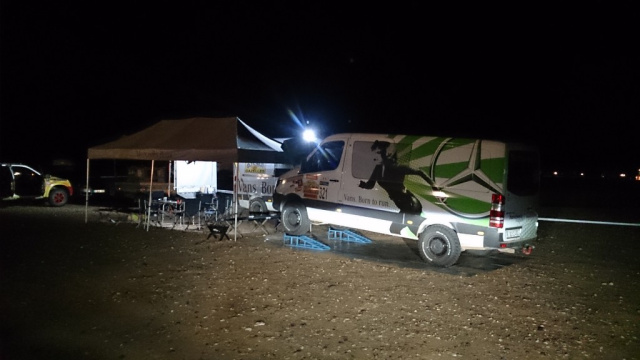 Übrigens: beide Sprinter kommen wie neu im Biwak an - ohne eine Beschädigung und ohne technische Probleme. Um die Fahrzeugreinigung muss sich an dem Abend auch keiner kümmern, denn der Wettergott lässt zu allem Überfluss noch einen Regenguss über das Gebiet nieder. 20 Minuten regnet es wie aus Kübeln das wird morgen eine Schlammschlacht bei der zweiten Etappe. Und dann auch das noch: Die