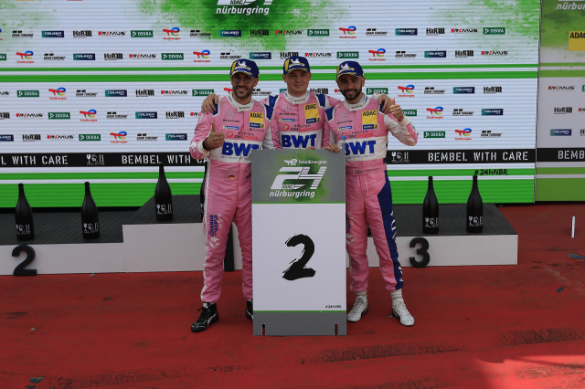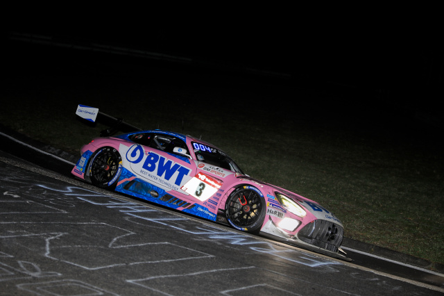 Noch viel besser lief es bei Getspeed. Die beiden pinken BWT-Autos hielten sich das gesamte Rennen schadlos und lagen stets in der Spitzengruppe. Getspeed konnte es sich sogar leisten, bei den häufigen Schauern im letzten Rennviertel auf getrennte Strategien zu setzen, um mindestens ein Auto durchzubringen. Dadurch wechselte die Reihenfolge ständig, sodass bis kurz vor Schluss nicht klar war, wer die Nase vorn haben würde. Zwischenzeitlich konnte Fabian Schiller in der #3 sogar den führenden Audi von Dries Vanthoor angreifen, kam aber nicht vorbei. Ein kleiner Fehlgriff bei der Reifenwahl bei einsetzendem Regen, als die Mannschaft Risiko ging und auf Slicks blieb, besiegelte die Chancenlosigkeit der Crew gegen den Audi. Immerhin konnte man sich die starke Konkurrenz in Form des Car-Collection-Audis vom Leib halten, sodass die beiden pinken BWT-AMGs #3 mit Götz, Christodoulou und Schiller und #4 mit Engel, Juncadella und Marciello zusammen auf das Podest fahren konnten.