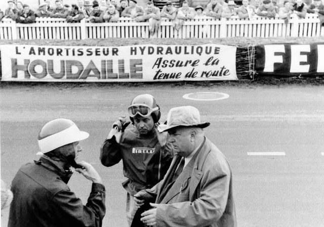 Le Mans, 1955: John Fitch (links), der später im Rennverlauf tödlich verunglückte Pierre Levegh und Rennleiter Alfred Neubauer im Gespräch.