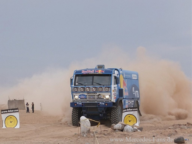 Derweil gibt es mit Nani Roma im Mini einen neuen Tagessieger zu vermelden, Teamkollege Peterhansel bleibt ihm jedoch dicht auf den Fersen und in der Gesamtwertung vorne. Der Typ findet einfach immer den richtigen Speed um die Konkurrenz am Ende des Tages alt aussehen zu lassen. Dahinter die üblichen Verfolger. Ich denke mal, dass sich morgen zum ersten Mal zeigen wird, wer hier bereits auf der letzten Rille kämpft und was riskiert und wer auch langfristig bei dieser Rallye vorne fahren kann. Matthias Kahle erleidet zwar am Schluss der Etappe einen Lüfterschaden, bringt aber trotzdem einen 23. Platz ins Ziel. Er etabliert sich auf Position 17 Gesamt und das sorgt durchaus für gute Laune im SAM Mercedes Team. Schließlich ist es die erste Dakar des Protoypen von Teamchef Sven Knorr. Allerdings hat Kahle ein großes Problem für die langen Etappen, er muss leicht Gas herausnehmen, da er seit gestern keinen sogenannten T4 Truck, also einen schnellen Service, der im Rennen mitfährt, mehr hat. Behringer ist auf seinem MAN raus.