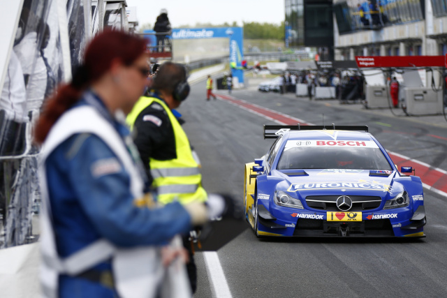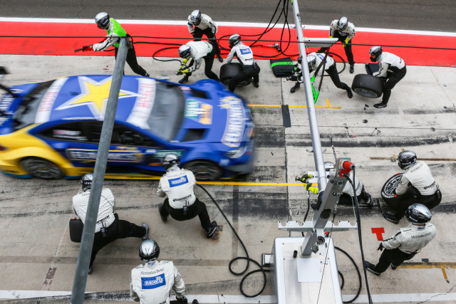 „Ich sehe die Markierungen auf dem Boden nicht aus dem Cockpit. Meine einzige Orientierung ist die klappbare Tafel mit einer Mittelmarkierung, die vor der Windschutzscheibe hängt. Sobald die Tafel die Scheibe berührt, muss ich stehen!“, beschreibt Gary Paffett diese Gratwanderung. Nur so haben die Mechaniker, die bereits neben dem Fahrzeug hocken, die Chance, ihre Schlagschrauber punktgenau anzusetzen. Jede Abweichung, und sei es nur um wenige Zentimeter, hätte ein zeitraubendes Weiterrücken zur Folge.