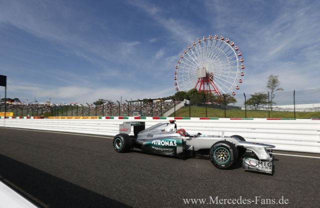 Beim Großen Preis von Japan 2012 auf dem Rennkurs in Suzuka, das Sebastian Vettel gewann, haben die Mercedes-Silberpfeile knapp die Punkte verpasst. Während Rosberg schon früh nach einer Kollision ausgeschieden war, fuhr Michael Schumacher ein engagiertes Rennen. Er startete nach einer Rückversetzung vom 23. Startplatz und konnte bereits in der Anfangsphase des Rennens viele Positionen gutmachen. Bis ins Ziel konnte sich der Rekordweltmeister im Vergleich zu seiner Startposition um zwölf Plätze verbessern. "Das Rennen hier in Japan hinterlässt bei mir etwas gemischte Gefühle - denn es ist natürlich schade, wenn man so knapp die Punkteränge verfehlt, auch wenn das Rennen insgesamt vielleicht sogar besser lief als erwartet", erklärte der Mercedes-Weerksfahrer Deutsche nach der Zieldurchfahrt.