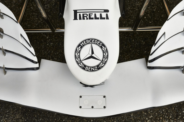 Der Bereich um die Bargeboards am vorderen Ende des Chassis erweckt den Anschein, als ob die weiße Farbe "abgekratzt" worden sei, sodass darunter die silberne Lackierung sichtbar wird. Dieser Effekt zollt der Ursprungslegende der Silberpfeile Tribut. Als der Mercedes-Benz W 25 im Jahr 1934 in der 750-kg-Formel an den Start ging, war er gemäß der Legende vor seinem ersten Rennen leicht übergewichtig. Aus diesem Grund entfernte das Team die weiße Farbe, um Gewicht einzusparen, wodurch die metallische Karosserie zum Vorschein kam.
