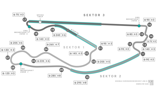 Die Tatsache, dass es drei lange Geraden mit DRS-Zonen gibt, die jeweils in langsame Kurven münden, verspricht gute Überholmöglichkeiten. Kurve 11 und Kurve 17 werden wahrscheinlich die Schlüsselstellen sein, auf die man achten muss.