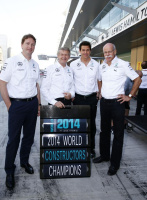 Nico Rosberg war es zuvor gelungen, das prestigeträchtige Duell um die Pole Position erneut für sich zu entscheiden. Damit hat der in Wiesbaden geborene Rosberg insgesamt elfmal die Pole Position in dieser Saison herausfahren können. Hamilton, der insgesamt bei 15 Rennen in der ersten Startreihe stand, konnte dagegen nur sieben Mal von Platz 1 ins Rennen gehen. Damit haben die Silberpfeile 18 von 19 Pole Positions in dieser Saison geholt, zwölf Mal standen beide Fahrer gemeinsam in der ersten Reihe. In Abu Dhabi brauste Hamilton schon am Start an Rosberg vorbei und wurde nach 55 Runden als Weltmeister abgewunken. Daimler-Boss Dr. Zetsche (siehe Foto v.l.n.r.; Vertriebsvorstand Ola Källenius, Entwicklungsvorstand Dr. Thomas Weber, Motorsportchef Toto Wolff, Vorstandsvorsitzender Dr. Dieter Zetsche) kommentierte direkt nach dem Rennen: Jetzt stehen wir da, wo wir hingehören!“
