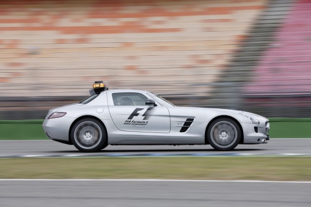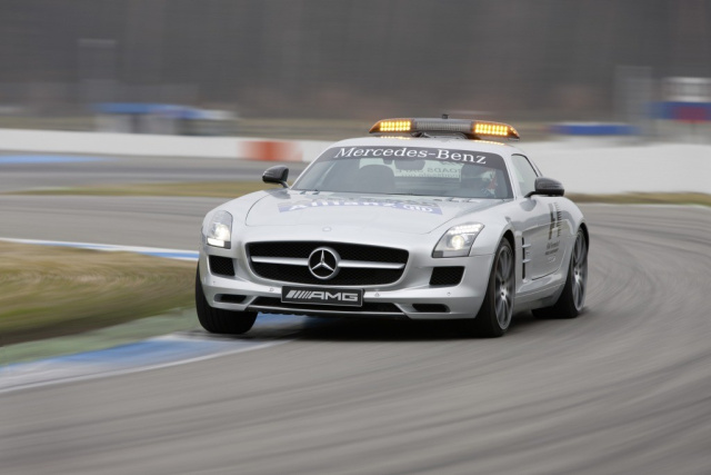 Der SLS AMG Official F1 Safety Car wird von der Rennleitung immer dann auf die Strecke geschickt, wenn Unfälle oder schlechte Witterungsverhältnisse einen sicheren Rennverlauf gefährden. Pilotiert wird der Flügeltürer von Bernd Mayländer (Deutschland), der 39-jährige Rennfahrer ist in dieser Funktion seit 2000 für die FIA (Fédération Internationale de lAutomobile) tätig. Mayländer ist während des Rennwochenendes nicht nur für die Formel 1, sondern auch für die meisten Rahmenrennen, etwa die GP2-Serie oder den Porsche Supercup, im Einsatz.