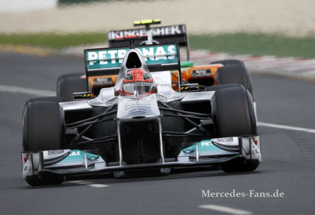 Schumacher stellte seinen Mercedes GP in der 22 Runde ab, die frühe Kollision mit Jaime Alguersuari, die Schumacher einen Reifenschaden bescherte, hat wohlmöglich auch den Rennwagen beschädigt. Aus Sicherheitsgründen bleibt der Wagen an der Box. Auch Nico Rosberg muss seinen Mercedes GP auf Grund einer Berührung mit Barichello abstellen. Kein optimaler Auftakt für die Sternen-Truppe im Jubiläumsjahr. Problematischer aber als das Pech dürfte sein, dass die Mercedes-Formel 1 Autos einfach immer noch nicht schnell genug sind. Die McLaren-Mercedes von Hamilton und Button dagegen sind es!