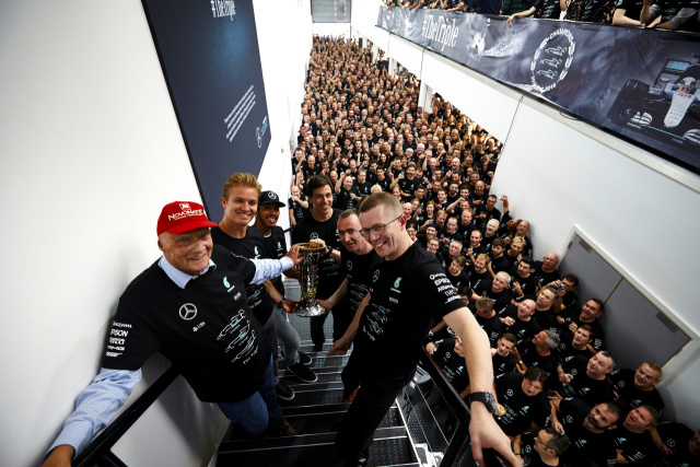 Toto Wolff, Mercedes-Benz Motorsportchef Heute hier zu stehen und den Konstrukteurs-Pokal in Händen zu halten, der ab Dezember dann drei statt nur zwei Sterne tragen wird, erfüllt mich mit unheimlich viel Stolz. Was wir in den vergangenen drei Jahren geschafft haben, ist eine absolut fantastische Leistung. Vor einigen Wochen habe ich Ross Brawn getroffen. Wir tranken gemeinsam einen Kaffee und er sagte mir, dass er besonders stolz darauf sei, dass dieses Team niemals nachgelassen habe, was schnell hätte geschehen können. Aber jeder Einzelne von uns blieb für drei Jahre am Stück am Ball - das ist eine außergewöhnliche Leistung. Es ist mir eine große Ehre, mit all den Jungs und Mädels hier zusammenzuarbeiten. Von Paddy und Andy, die uns alle ständig gedanklich antreiben, über unsere großartigen Fahrer, die einen enormen Anteil an diesem Erfolg haben, bis hin zu den hunderten von Teammitgliedern, die sich tagtäglich die Finger wundarbeiten, um die Werkzeuge und Ressourcen zu erschaffen, die wir für den Erfolg benötigen. Ich habe es schon früher gesagt und ich glaube es mit jedem Tag mehr: Wir haben die beste Fahrerpaarung in der Formel 1 - und das beste Team an Menschen im Hintergrund. Jeder treibt den anderen zu neuen Höchstleistungen an. Sobald wir denken, dass das Auto nicht schneller werden kann, finden wir irgendwie erneut eine Zehntelsekunde und das haut uns jedes Mal aufs Neue um. Erst wenn all das zusammenkommt, kann man dorthin gelangen, wo wir heute sind. Am Wochenende wurde ich gefragt: "Was ist das Erfolgsgeheimnis des Teams? Gibt es einen speziellen Grund, warum wir dort sind, wo wir sind?" Das Einzige, was mir dazu einfiel, war, dass es 1.500 Gründe dafür gibt. All die 1.500 Menschen hier in Brackley und Brixworth haben diesen Traum wahr werden lassen und ich kann mich bei jedem von ihnen gar nicht genug für ihren Anteil an dieser Erfolgsgeschichte bedanken.