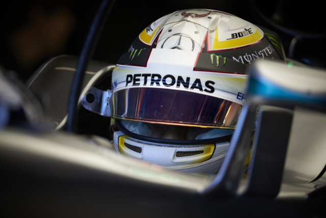 Voll konzentriert auf sich selbst - Lewis Hamilton im Cockpit.