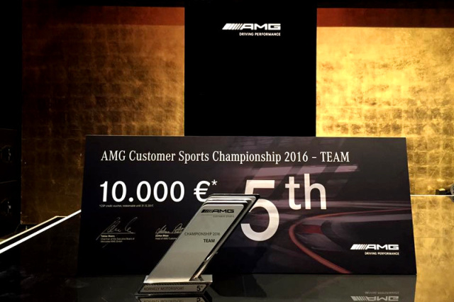 Insgesamt traten in dieser Saison 52 Teams mit AMG Fahrzeugen bei nationalen und internationalen Meisterschaften an um Punkte und Siege einzufahren. Dank einem durchaus erfolgreichen Jahr mit dem Mercedes-Benz SLS AMG GT3, sowie dem neu dazu gekommen Mercedes-AMG GT3, sicherte sich Kornely Motorsport den fünften Platz in der begehrten Teamwertung der AMG Customer Sports Championship 2016. Glücklich und stolz nahm Teamchef Sebastian Kornely die Trophäe und den 10.000 Euro Scheck am Abend entgegen und feierte dann gemeinsam mit seinem Team und der ganzen AMG Familie eine gelungene Saison 2016.
