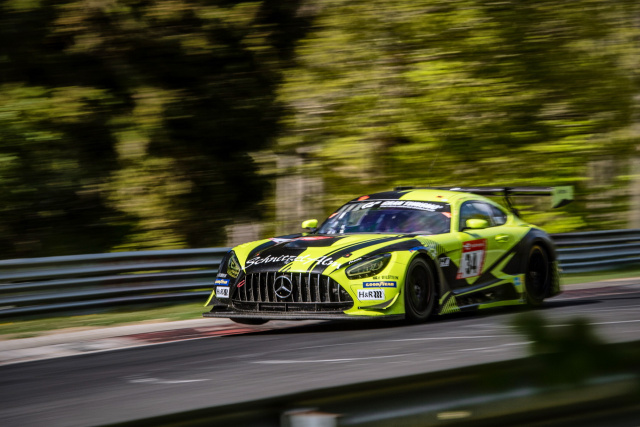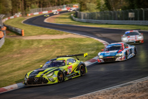 Das erste Rennen des Wochenendes am Samstagabend war durch wiederkehrende Regenschauer geprägt. Die sechs Mercedes-AMG GT3 kamen mit diesen unbeständigen Wetterbedingungen in der Eifel jedoch gut zurecht und arbeiteten sich im Verlauf des dreistündigen Rennens kontinuierlich nach vorne. Maro Engel, Daniel Juncadella und Jules Gounon, die mit dem GT3 #4 des Mercedes-AMG Teams GetSpeed von Rang sechs gestartet waren, beendeten den Lauf auf dem dritten Platz.