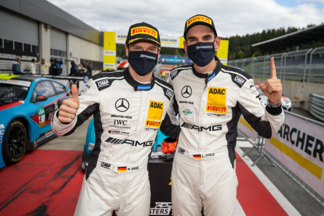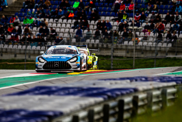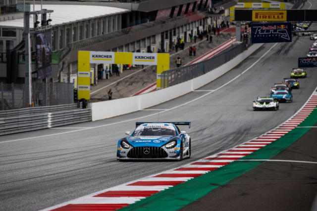 Bei Temperaturen um den Gefrierpunkt sicherte sich Maro Engel (GER) am Sonntagmorgen im Mercedes-AMG GT3 #22 von Toksport WRT mit der drittschnellsten Runde im Qualifying eine gute Ausgansposition für das Jubiläumsrennen auf dem Red Bull Ring. Der Start zur Mittagszeit verlief für ihn jedoch nicht optimal: Engels Fahrzeug wurde eingeklemmt und er büßte im Verlauf der ersten Runde drei Positionen ein. Mit einem perfekt getimten Überholmanöver eroberte er zwar Platz fünf zurück, musste diesen aber kurz vor Ende seines Stints wieder abgeben. Die Wende im Duell um einen Podiumserfolg brachte der Boxenstopp. Den Wechsel von Engel auf Teamkollege Luca Stolz (GER) führte das Team nahezu punktgenau zur vorgegebenen Mindestzeit durch, so dass Stolz als Viertplatzierter in die entscheidende Phase des Rennens gehen konnte. Als gegen einen vor dem Toksport WRT-Duo platzierten Konkurrenten eine Zehn-Sekunden-Strafe ausgesprochen wurde, lag Stolz auf dem theoretischen dritten Rang. Noch sah er sich den Angriffen der hinter ihm liegenden Rivalen ausgesetzt, denen er sich aber bis zur Zieldurchfahrt auf dem 4,3 Kilometer langen Kurs erwehrte. Nach Berücksichtigung der ausgesprochenen Zeitstrafen bedeutete das im Endergebnis zunächst Platz drei. Das Team Toksport WRT legte aufgrund eines aus ihrer Sicht unsportlichen Manövers Protest gegen die Wertung des Rennergebnisses ein. Diesem wurde stattgegeben, womit die Startnummer 22 letztlich auf Rang zwei hochgestuft wurde. Mit dem insgesamt fünften Podiumserfolg in dieser Saison kletterten Engel und Stolz in der Meisterschaftswertung auf den dritten Platz und haben mit nur sechs Punkten Rückstand auf die Führenden in der Fahrerwertung bei noch vier ausstehenden Rennen noch alle Chancen im Wettbewerb um den Titel.