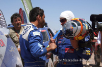 Wir stehen am Ziel und warten gespannt, da kommt der erste VW, aus der Ferne nicht zu erkennen, welcher der beiden Kontrahenten es ist. Dann wird klar, es ist Al Attiyah. Die Menge jubelt. Klarer Fanvorteil für den Katari (der im Übrigen supersymphatisch ist). Er steigt aus und ist offensichtlich sauer, keine richtige Freude über den Sieg. Dann wird klar warum. Sainz kommt, nur knapp hinter ihm (also hat Sainz nur rund drei Minuten verloren) steigt aus und stürmt auf den Teamkollegen los. Noch mit Helm auf dem Kopf gibt es eine Menge Diskussion und beim Spanier den erhobenen Zeigefinger. Al Attiyah äussert sich danach eindeutig. Sainz solle lernen, wie man das Sentinel benutzt (reagiert ab 150m Abstand und signalisiert ein kommendes Überholmanöver). Er sei Zick Zack gefahren um ihn, AL Attiyah ja nicht vorbeizulassen. Sein ruhiger Co, Timo Gottschalk betätigt: wir ##