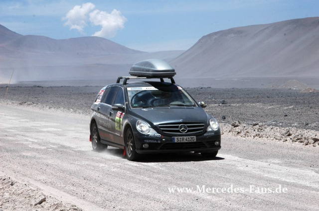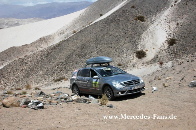Atemberaubende Bilder von unserem Team aus der Mercedes R-Klasse im Tross der Dakar Rally. Ellen Lohr und Jörg Sand haben nun die Überquerung des San Francisco-Pass absolviert und spektakuläre Bilder übermittelt. Aber lassen wir sie selbst zu Wort kommen: "Heute bei der Dakar also die erste Andenüberquerung, alle freuen sich, denn das bedeutet auch auf der Serviceroute für uns in der Mercedes R-Klasse spektakuläre Landschaften. Unser Unimog hat es inmitten der Nacht ins Bivak geschafft. Grossartige Leistung angesichts der teilweise richtig hohen Dünen, für die man am besten viel Power unter der Haube hat."