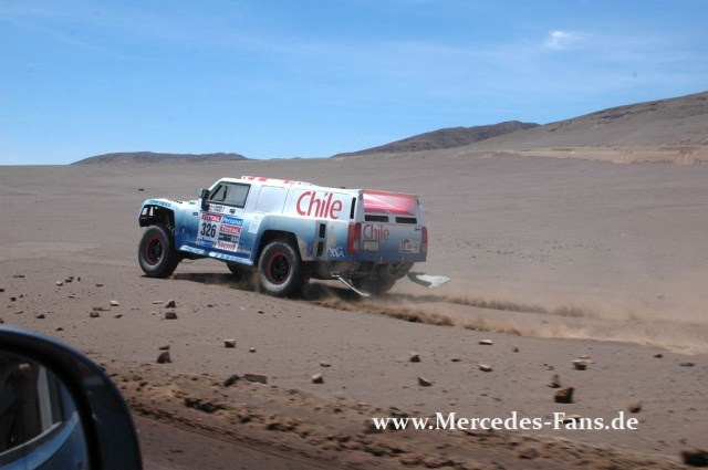 Unterwegs treffen wir den dritten Fahrer im Team von Robby Gordon, mittlerweile bereits aus dem Rennen und nun mit dem Rennauto auf der Serviceroute unterwegs. Der Chilene freut sich von uns fotografiert zu werden