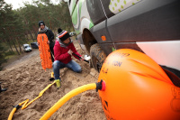 Mehrere dünenartige Sandsteigungen brachten dann irgendwann auch die letzten Teilnehmer an ihre Grenzen und die Transporter zum stehen. Nun konnten die Mädels ausgiebig das Freischaufeln von steckengebliebenen Fahrzeugen üben. Neben den traditionellen Sandschaufeln und Sandblechen kam auch ein moderner Airbag namens Airjack zum Einsatz, mit dem jedes Fahrzeug bestückt ist. Dieser wird unter die Karosserie gelegt und mittels Auspuffgasen aufgeblasen. Dadurch hebt sich das Fahrzeug an und die Sandleitern können bequem unter die Räder gelegt werden. Tolle Sache, die aber geübt sein will, damit es unter Extrembedingungen im Wettkampf mühelos gelingt. Auch das Bergen mittels eines anderen Fahrzeuges übte man mehrfach.