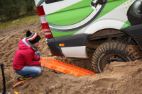 Nachdem das Aufblasen des Ballons reibungslos geklappt hat, müssen die Sandbleche entsprechend unter die Räder platziert werden und im besten Fall ist es dem Fahrer nun möglich das Auto rückwärts wieder aus der Versenkung zu bewegen. Und wenn es einmal nicht gleich klappt, heißt es doch bekanntlich: nicht zur Strafe, nur zur Übung. :)