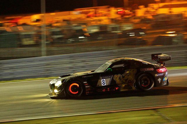 Der "Schnellste Goldbär der Welt" von HARIBO RACING sah ebenfalls das Ziel, und zwar als zweitbester Mercedes-AMG auf Rang 9. Schlussfahrer Lance David Arnold hatte allerdings noch eine Schrecksekunde zu verkraften, als er sich im einsetzenden Regen drehte und leicht in die Leitplanke einschlug. Er konnte aber die Fahrt vfortsetzen und den Goldbär sicher ins Ziel bringen. Ihre Chancen auf einen vorderen Platz hatten sie allerdings schon in der Nacht eingebüßt, als sich Routinier Uwe Alzen eine Strafe von 3,5 Minuten wegen eines Gelb-Vergehens einhandelte, was die Crew aussichtslos zurück warf. Ohne diesen Fehler hätte man sicher um den Titel des besten Mercedes mitkämpfen können.