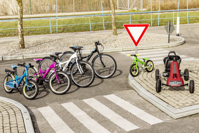 Anschließend, ab 4 Jahren bzw. einer Körpergröße ab ca. 105 cm, fällt der Umstieg aufs Kinderfahrrad umso leichter. Auch dieses besitzt einen Aluminiumrahmen und „Schwalbe Big Apple“-Reifen, hier allerdings im Format 16 Zoll. Die Sitzhöhe ist von ca. 50-59 cm verstellbar. Das Kinderfahrrad wiegt ca. 9,5 kg und ist in Südseeblau, Pink oder in Weiß als Mercedes-AMG Variante erhältlich.