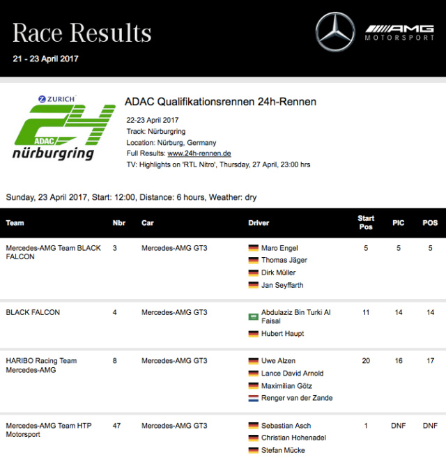 Nach 41 packenden Runden über die Nürburgring-Nordschleife errangen Maro Engel, Thomas Jäger, Dirk Müller und Jan Seyffarth (alle GER) im Mercedes-AMG GT3 #3 im diesjährigen ADAC Qualifikationsrennen 24h-Rennen Rang fünf. Das Quartett des Mercedes-AMG Team BLACK FALCON war von Platz fünf in das Rennen gestartet und bot während der gesamten sechsstündigen Renndistanz eine solide Leistung. Zweitbestes Fahrzeug aus Affalterbach wurde die Startnummer 4 des BLACK FALCON Kundenteams, die sich mit dem Duo Abdulaziz Al Faisal (KSA) und Hubert Haupt (GER) den 14. Platz sicherten. Als dritter Mercedes-AMG GT3 beendete das HARIBO Racing Team Mercedes-AMG (#8) mit Uwe Alzen, Lance David Arnold, Maximilian Götz (alle GER) und Renger van der Zande (NED) die Generalprobe auf der Nürburgring-Nordschleife auf Rang 17.