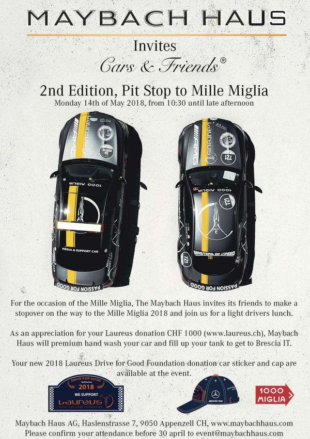 Montag, den 14. Mai sollten Mercedes-Fans im Kalender rot anstreichen. Das Maybach Haus in Appenzell lädt anlässlich der Mille Miglia 2018 zum "2nd Edition, Pit Stop to Mille Miglia".