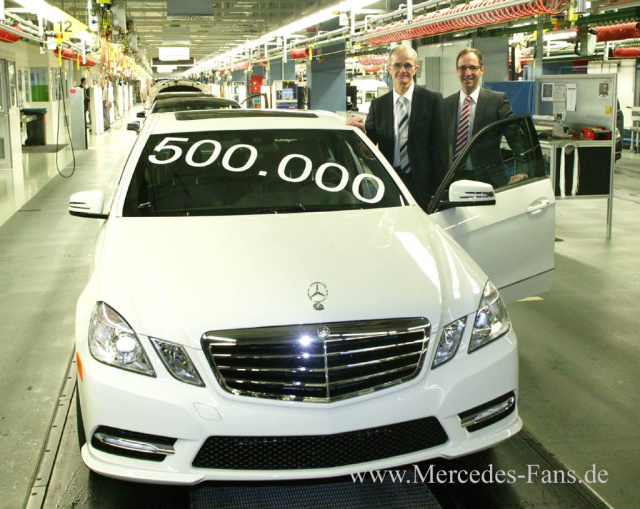 Nur knapp drei Jahre nach Produktionsstart wurde im Mercedes-Benz Werk Sindelfingen eine Bestmarke erreicht: Eine halbe Million E-Klasse Limousinen der Baureihe 212 rollten in dieser Zeit vom Band. Das Jubiläumsfahrzeug ist ein calcitweißer E 350 4MATIC mit umfangreicher Ausstattung, der für einen Kunden aus den Vereinigten Staaten produziert wurde. Neben der serienmäßigen Sicherheitsaustattung hat die Limousine zusätzlich das Spur-Paket und einen aktiven Totwinkel-Assistenten an Bord. Die E-Klasse ist der Inbegriff einer Business-Limousine: modern, faszinierend und sicher. Das bestätigen unsere Kunden und die hohe Akzeptanz im Markt. Es freut mich besonders, dass unser Jubiläumsfahrzeug an einen überzeugten Kunden aus den Vereinigten Staaten geht, sagte Dr. Willi Reiss, Leiter des Mercedes-Benz Werks Sindelfingen.