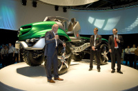 Einen optisch starken Eindruck vermitteln die vier gleich großen Räder im 5-Stern Alufelgen Design. Bertrand Janssen betont ausdrücklich: Wir haben keineswegs im sinnfreien Raum gearbeitet. Es handelt sich hier um ein puristisches, aber dennoch konzepttreues Fahrzeug mit dem Anspruch, dass sich Details in späteren Baureihen wiederfinden können. Wir haben weiterhin die wesentlichen Merkmale des Unimog mit aufgegriffen, die das Fahrzeug seit 60 Jahren und auch in Zukunft prägen werden wie beispielsweise Portlachsen, Schraubenfedern oder das Rahmenkonzept. Die Designstudie 60 Jahre Unimog ist allerdings kein Prototyp für eine neue Baureihe. Hiermit wird aber deutlich sichtbar, dass der Mercedes-Benz Unimog auch künftig einen innovativen Charakter und ein hohes Maß an Flexibilität in Ausführung und Bauweise besitzen wird. Eben ein einzigartigtes Fahrzeugkonzept.