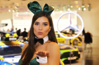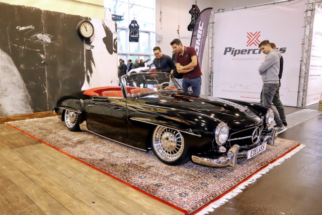 Einer der absoluten Showstopper war der schwarze 190 SL mit Airride-Fahrwerk von EDELWSS. Da müssen neidlos zugeben, den hätten wir auch gern auf unserem Stand gehabt. Aber auch so war bei uns die Hölle los. Ein Highlight war zweifelsfrei der MB 600 des verstorbenen Playboy-Chefs Hugh Hefner. Zumal das Mercedes-Flaggschiff von zwei echten Playmates flankiert wurde. Da war Selfie-Time angesagt.