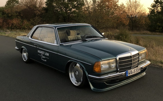 Get low - feel high! Dieser Mercedes-Benz 230 CE der Baureihe C123 ist das Fahrzeug, mit dem die Geschichte der Firma „Highest Low“ begann, und präsentiert sich hier als echter Tieflieger. Das Coupé war der erste Umbau des Teams und wurde als erstes Fahrzeug seiner Baureihe überhaupt mit einem Luftfahrwerk von Highest Low ausgestattet. Der Mercedes-Benz 230 CE aus dem Jahr 1983 wurde aber nicht nur mit einem Air Ride versehen, sondern bekam die Front-Stoßstange von Lorinser und ein Nardi-Lenkrad. Das Luftfahrwerk von Highest Low der 3. Generation wird in Verbindung mit Sachs-Dämpfern zusammengestellt und bietet dadurch ein smoothes Fahrgefühl. Der C 230 ist ein „ultimatiefer“ Hingucker.