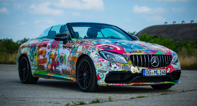 Hierbei handelt es sich um ein Mercedes-AMG C63S Cabriolet der besonderen Art. Diese C-Klasse aus Affalterbach wurde Dank Graffiti-Künstler „deklart®“ zu einem rollenden Kunstwerk. In seiner Kunst verbindet Dennis Klapschus Kindheitserinnerungen mit Lifestyle und schafft es so, die Menschen an ihre Träume zu erinnern. Charakteristisch für seine Kunstwerke ist dementsprechend die Kombination aus Walt Disney- und Comic-Figuren sowie Zitaten und Sprüchen, die den Betrachter dazu aufrufen, an seine Ziele zu glauben. Die Werke von Dennis Klapschus finden sich an den Wänden von zahlreichen VIPs, Fußballern, Musikern oder Schauspielern. Das C63S Cabriolet in diesem Gewand gibt es so nur einmal, es ist einzigartig.