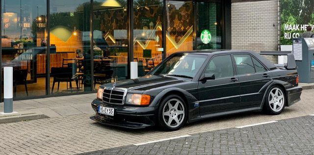 Wer unbedingt einen 190E 2.5 16V EVO II fahren möchte, aber das nötige Kleingeld vermisst, der sollte sich diesen W201 mal etwas genauer anschauen. Unter dem Kleid steckt ein 190E 2.5 16V. Das Evo II-Kit mit verbreiterten Radkästen, Kofferraumdeckel mit Schloss im Stern, passendem Spoiler, Auspuffanlage sowie EVO II-Stoßstangen kam erst später dazu. Der Preis für den Umbau lag damals bei 18.000 €. Während vom Mercedes-Benz 190E 2.5 16V insgesamt 5.743 Exemplare gebaut wurden, war der EVO II mit nur 502 Exemplaren nochmal deutlich seltener. Übrigens: der „einfache“ 190E 2.5 16V war von 0 auf 100 km/h nur 0,3 Sekunden langsamer als der EVO II.