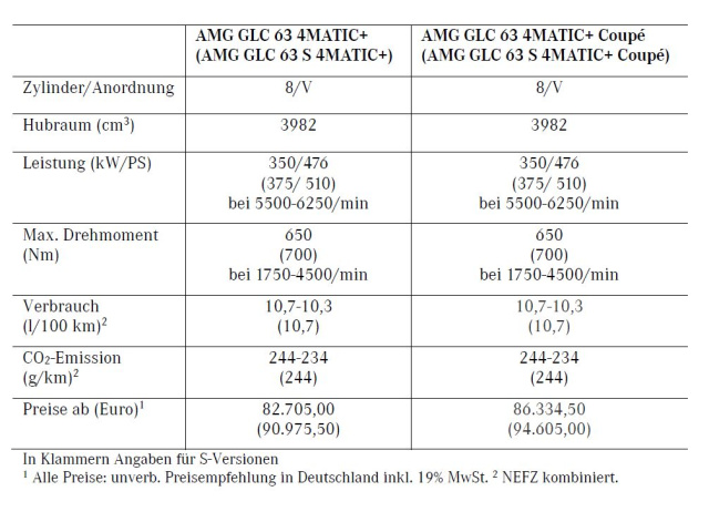 Hier die Übersicht GLC 63 4MATIC+ und GLC 63 4MATIC+ Coupé: