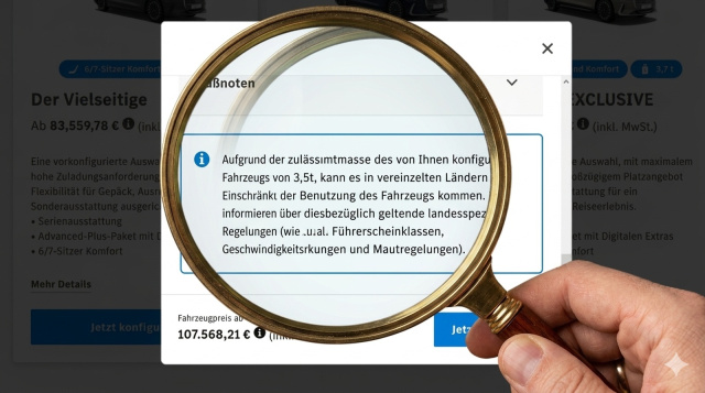 Immerhin: Mercedes weist im Konfigurator auf die unterschiedlichen Zulassungen hin. Im Online-Special zum Mercedes VLE findet man entsprechende Hinweise aber nur unter einer Vielzahl von kleingedruckten Fußnoten. Dort steht zu lesen: „Aufgrund der zulässigen Gesamtmasse des konfigurierten Fahrzeugs von mehr als 3,5t, kann es in vereinzelten Ländern zu Einschränkungen bei der Benutzung des Fahrzeugs kommen. Bitte informieren Sie sich über diesbezüglich geltenden landesspezifischen Regelungen (wie u.a. bezüglich Führerscheinklassen, Geschwindigkeitsbeschränkungen und Mautregelungen).“ Entsprechende Fußnoten müssen natürlich auch vom aufmerksamen Besucher der VLE-Sites gelesen werden, um zu erfahren, dass es der neue VLE in drei aktuellen Konfigurationen offiziell auf bis zu 3,7 Tonnen zulässige Gesamtmasse bringt.