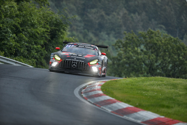 Besser kam die zweite Speerspitze von AMG aus dem Hause Haupt Racing Team ins Rennen. Die Startnummer 3 mit unter anderem Maximilian Götz am Steuer surfte sicher durch die Wetterkapriolen, auch wenn Luca Stolz einmal vom rechten Weg abkam und leicht die Leitplanken berührte. Ähnlich gut erging es der Startnummer 3 vom selben Bilstein-Team. Das dritte Auto von HRT, das in der Pro-Am-Klasse antrat, hielt sich ebenfalls schadlos.